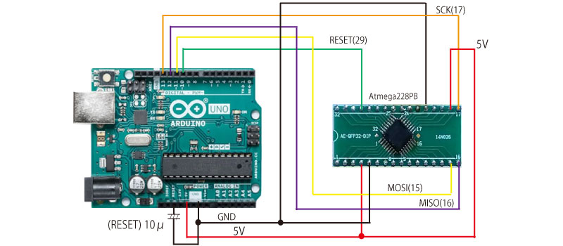 - UNOの RESET–GND間に10µF(自動リセット防止)