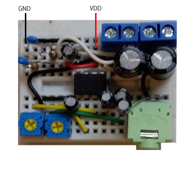パスコンの二階建て: データシートにも書いてありますように、電源ピン(2番)の近くに、電解コンデンサ100μFと積層セラミックコンデンサ0.1μFを並列に付けます。これで、低いノイズから高いノイズまで効率よく除去できます。