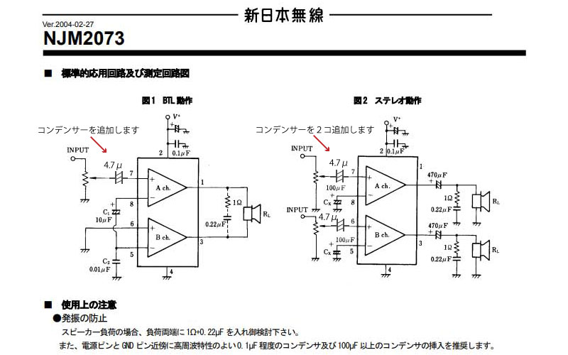 出力コンデンサの増量: 470μFを1000μF に変えてみてください。より迫力のある重低音が楽しめます。
