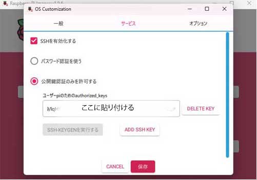 Raspberry Pi Imager の SSH 公開鍵欄に貼り付け